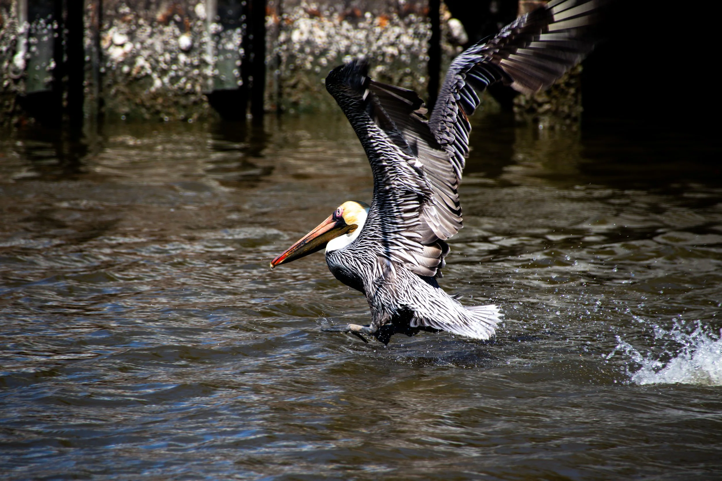A brown pelican makes a splash by the Kemah Boardwalk in Kemah, Texas.