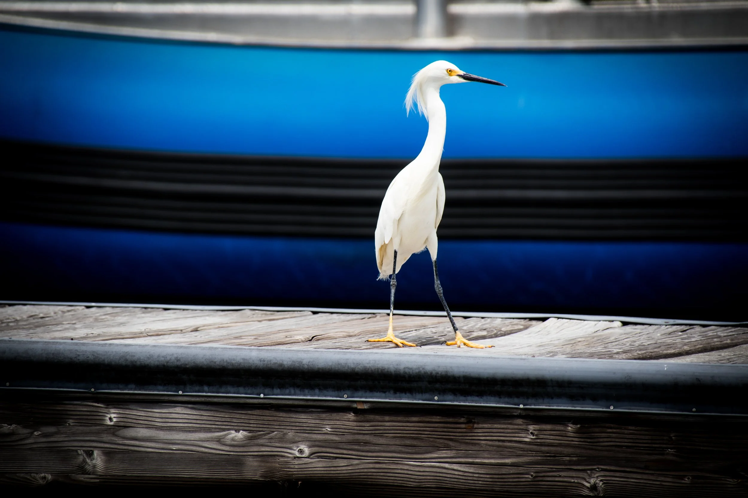 A snowy egret takes a walk along the dock at the Kemah Marina.
