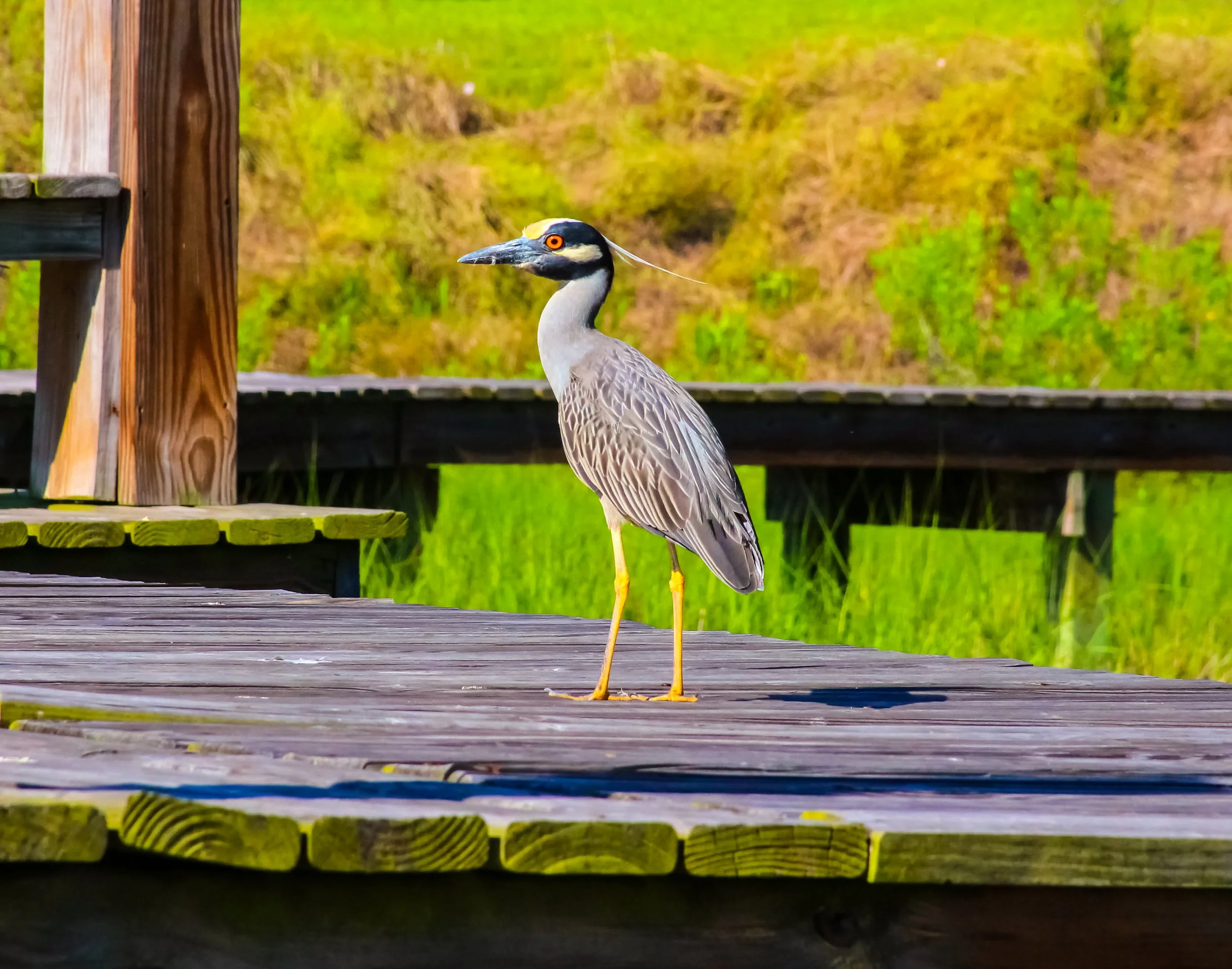 A yellow-crowned night heron stands out against the marsh at sunset in Seabrook, Texas.